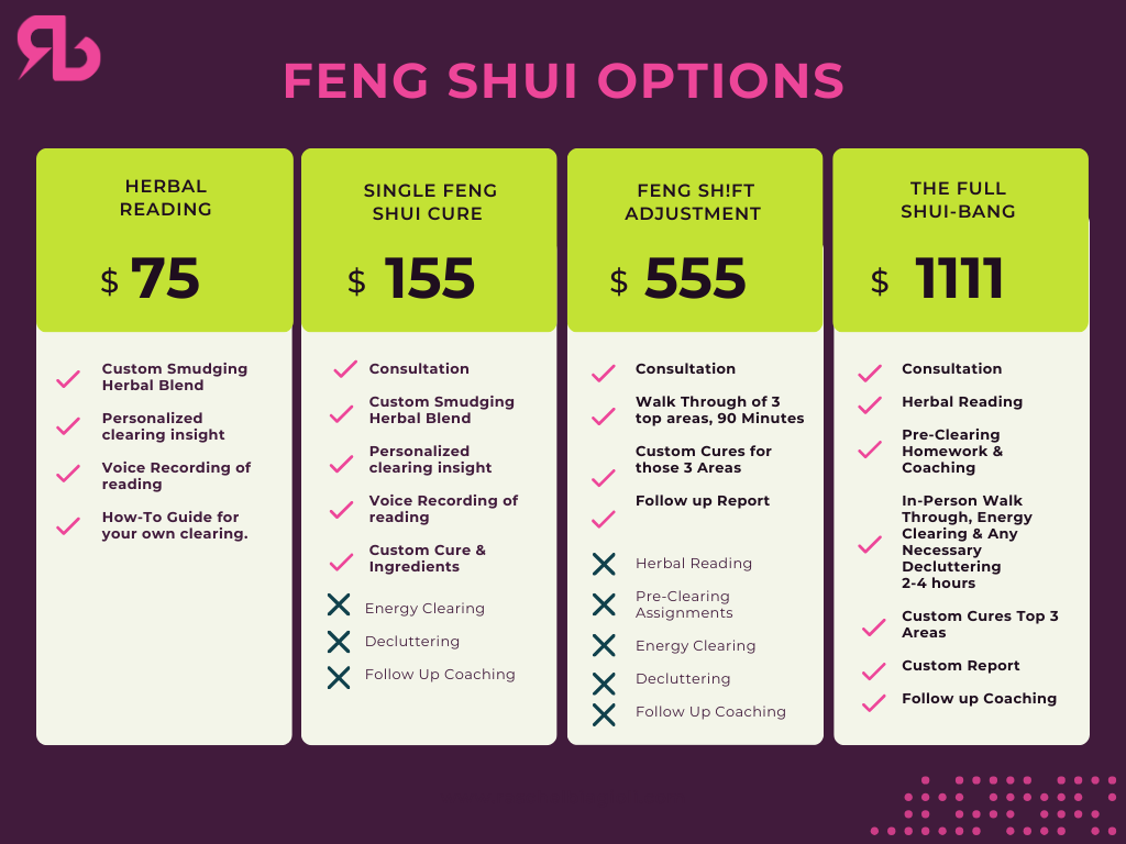 While your Full-Shui-Bang consultation includes recommendations and energetic support for your top 3 focus areas, additional enhancements may be available to deepen your experience and create lasting change in your space.
